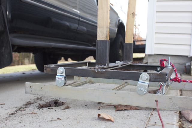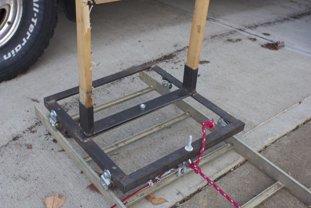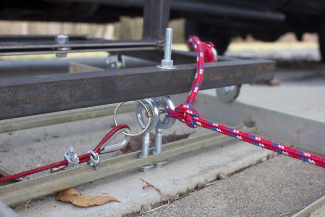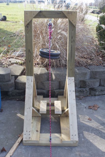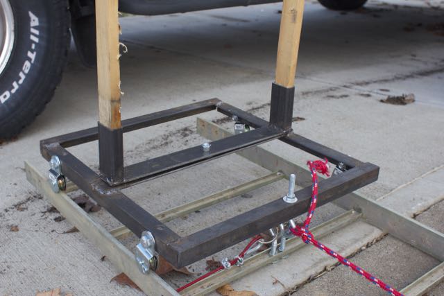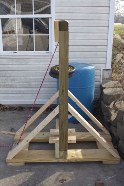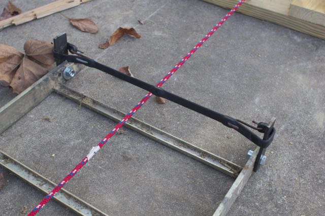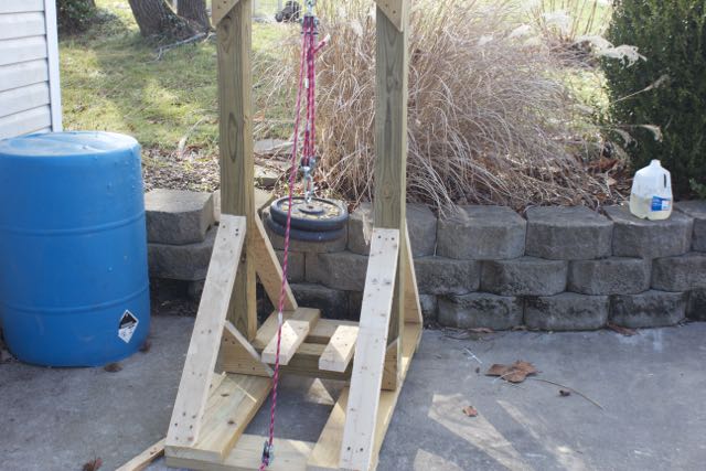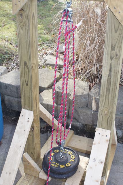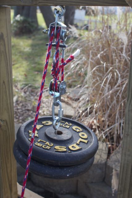 The last question was how to provide the mover with motion. My original idea was to use gravity by tilting the track at an angle, having a release and letting the cart roll down hill when the release was pulled. I did some quick searching and got a few more ideas from trolling motors to using a block and tackle. I decided on the later since (a) it would let me leave the track flat (reducing stress on the track and simulating the reality of a moving target more accurately) and (b) because I hadn’t played with block and tackle since engineering school ;-). I wasn’t sure how much force I would need or if a two fold purchase would pull enough rope, so I mocked the whole thing up using a step ladder turned to the side with a scrap 4×4 beam set across different height steps. Much to my surprise, with 50 lbs and a two fold purchase, I learned I only needed about three and a half feet of drop to get the mover all the way across the track at a good speed. (I can always easily add weight if I want to make it move faster or take away weight for a more leisurely pace).